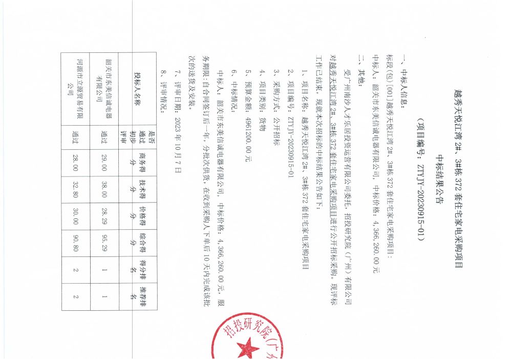越秀天悦江湾2#、3#栋372套住宅家电采购项目中标结果公告