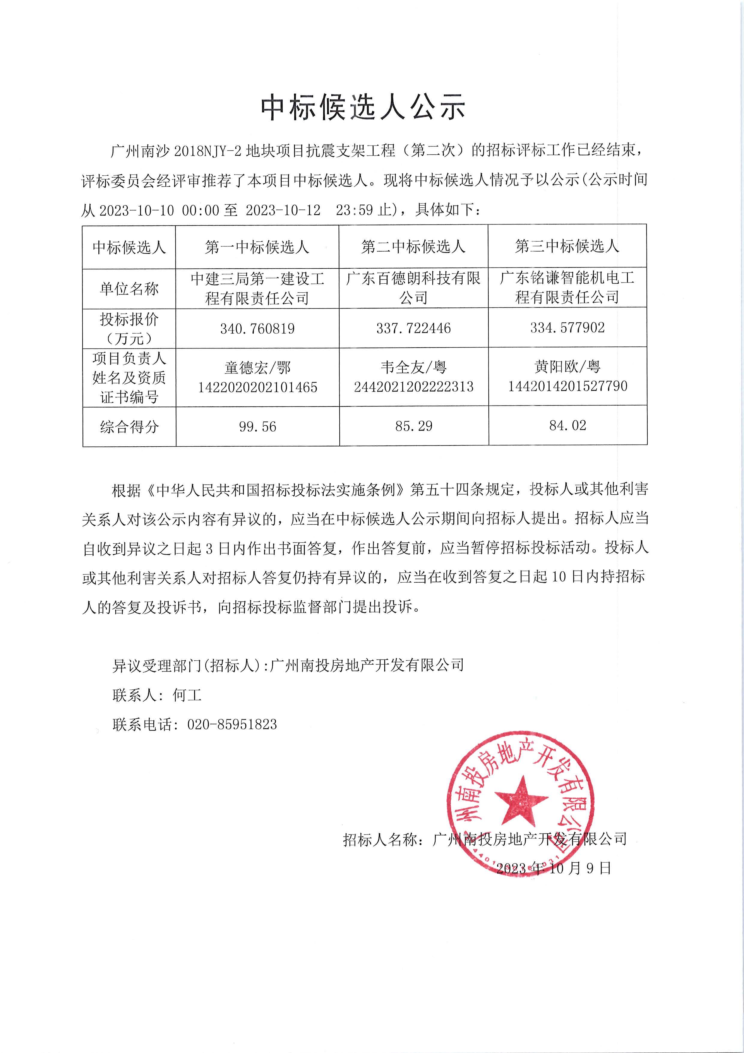广州南沙2018NJY-2地块项目抗震支架工程(第二次)中标候选人公示