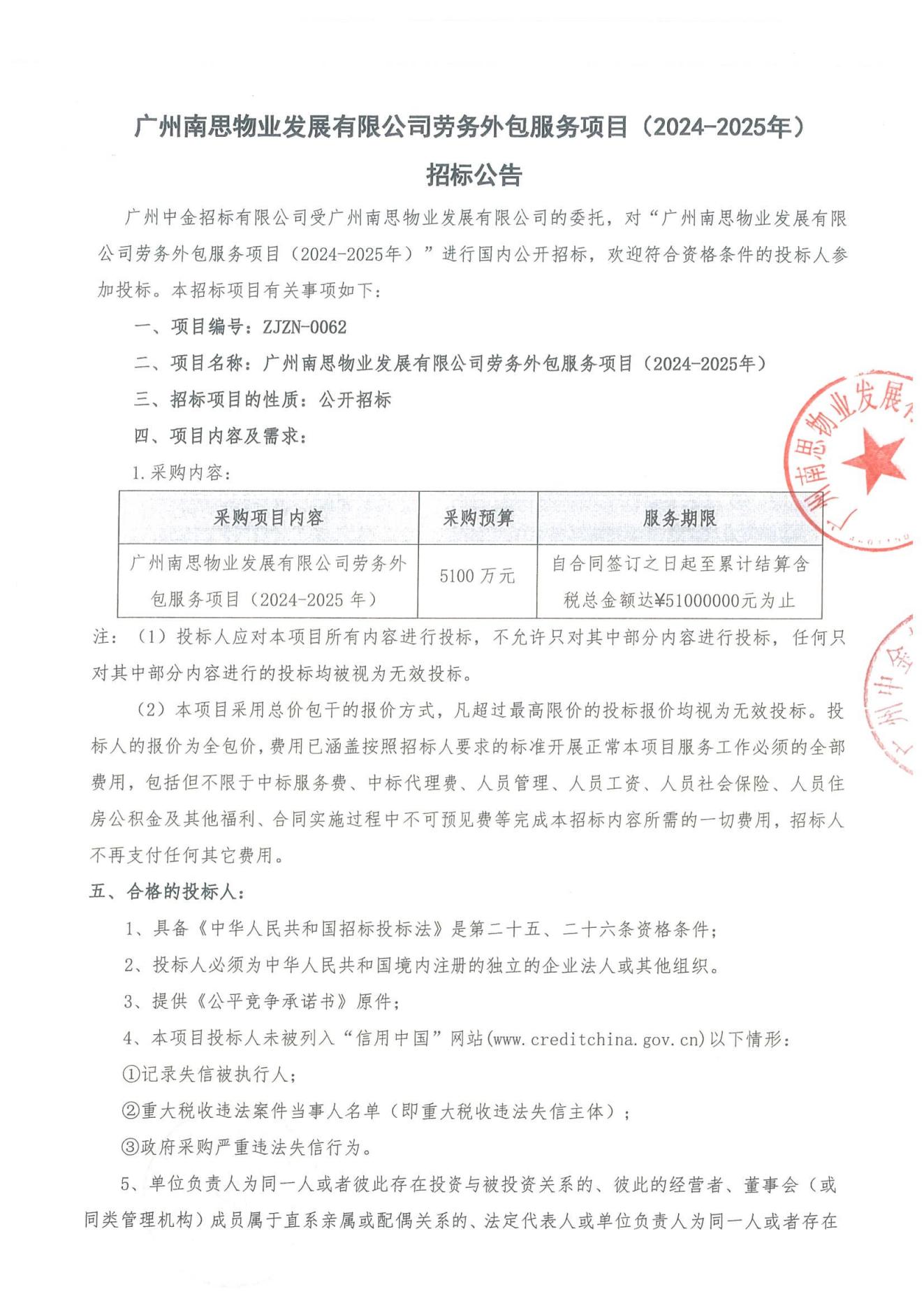 广州南思物业发展有限公司劳务外包服务项目 (2024-2025年) 招标公告