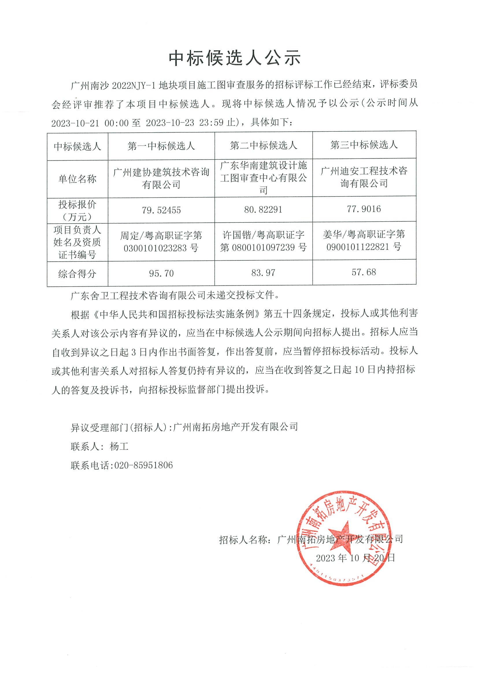 广州南沙2022NJY-1地块项目施工图审查中标候选人公示