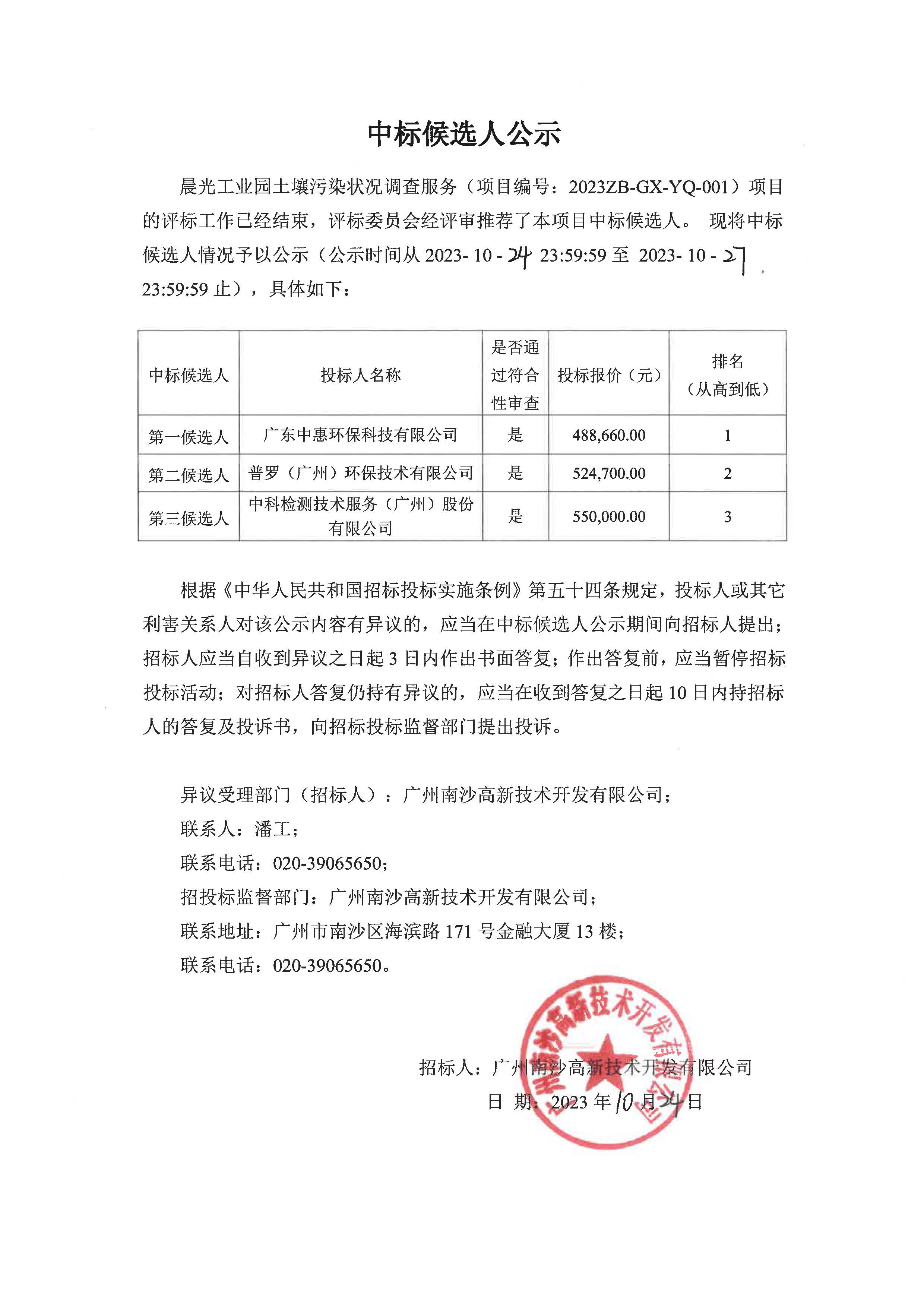 晨光工业园土壤污染状况调查服务中标候选人公示