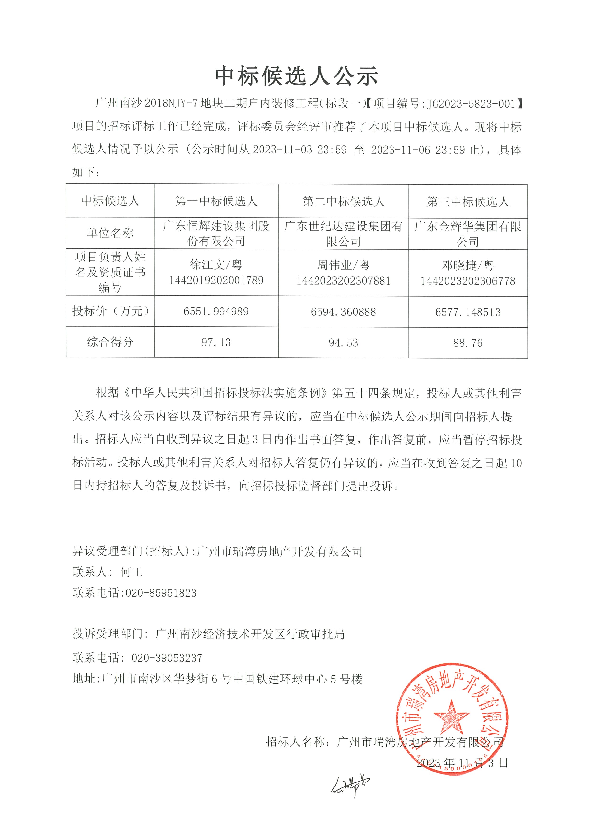 广州南沙2018NJY-7地块二期户内装修工程(标段一)中标候选人公示