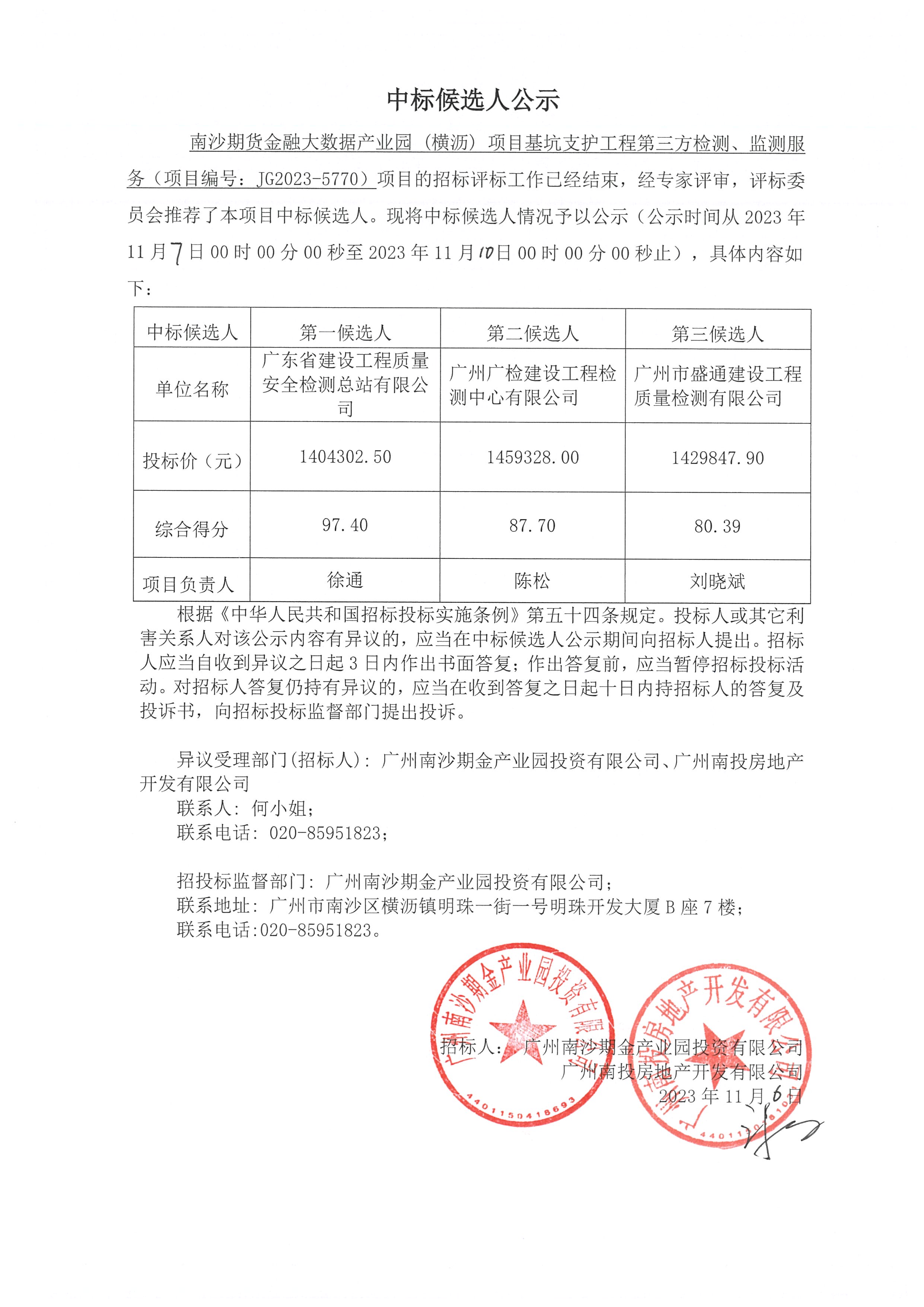 南沙期货金融大数据产业园(横沥)项目基坑支护工程第三方检测、监测服务中标候选人