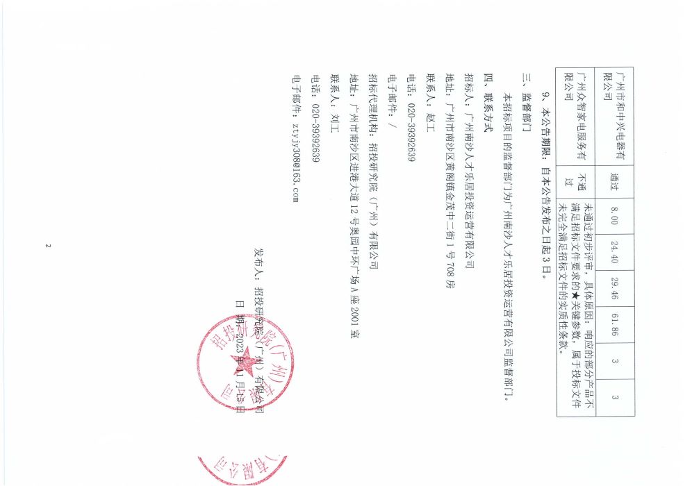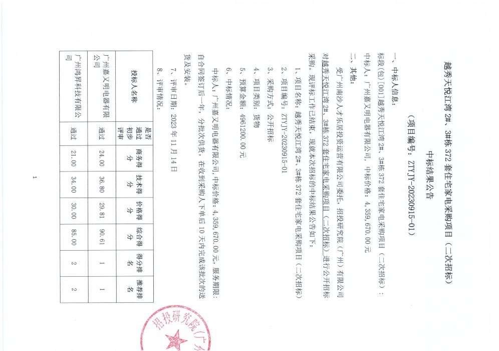 越秀天悦江湾2#、3#栋372套住宅家电采购项目(二次招标)-中标结果公示