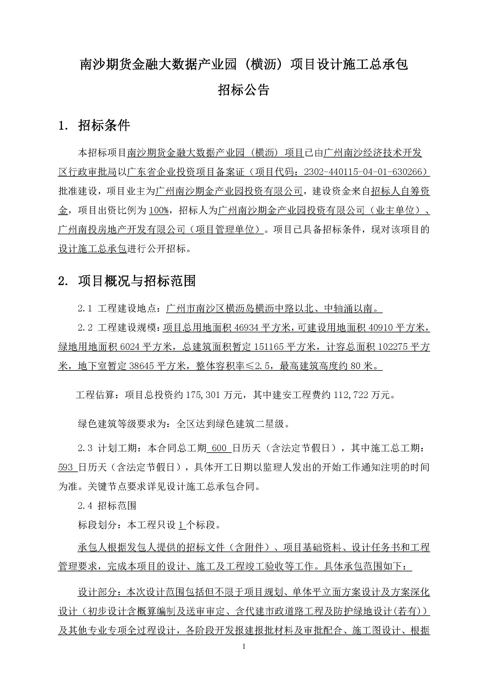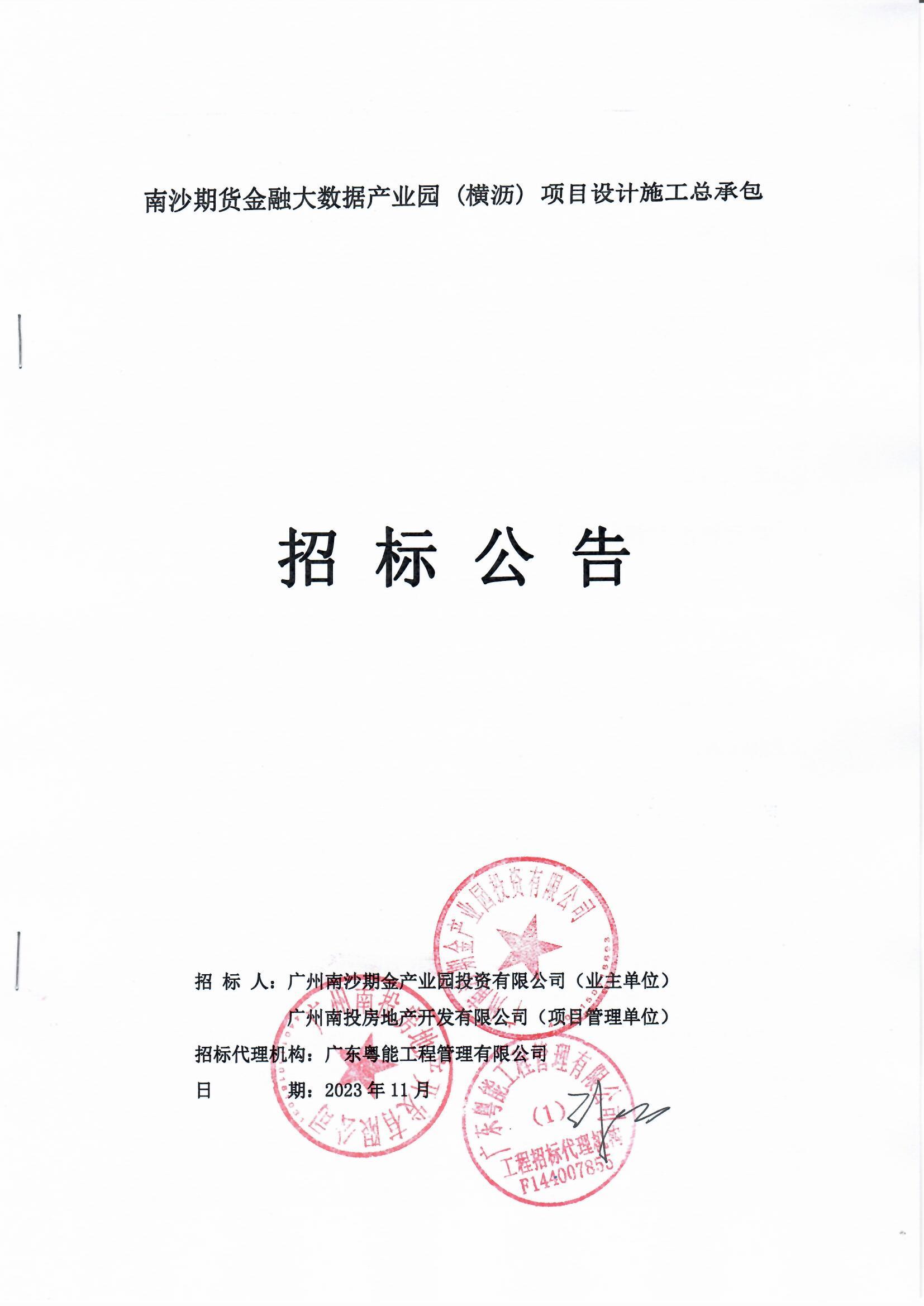 南沙期货金融大数据产业园 (横沥) 项目设计施工总承包招标公告