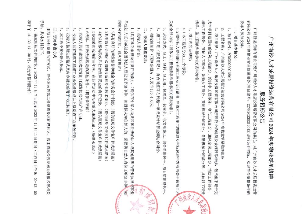 广州南沙人才乐居投资运营有限公司2024年度物业零星修缮服务招标公告