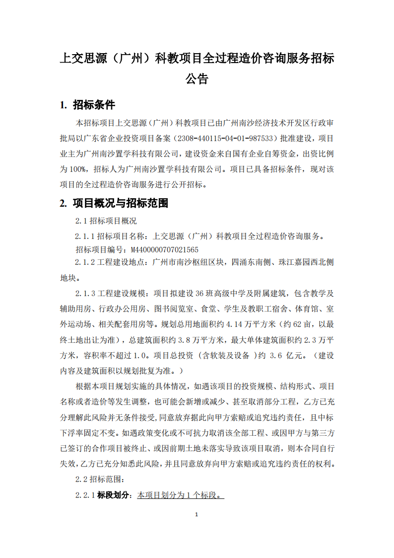上交思源(广州)科教项目全过程造价咨询服务招标公告