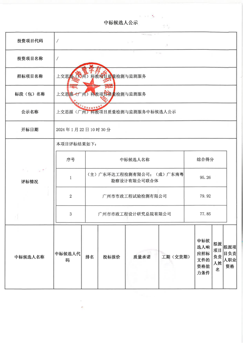 上交思源(广州)科教项目质量检测与监测服务中标候选人公示