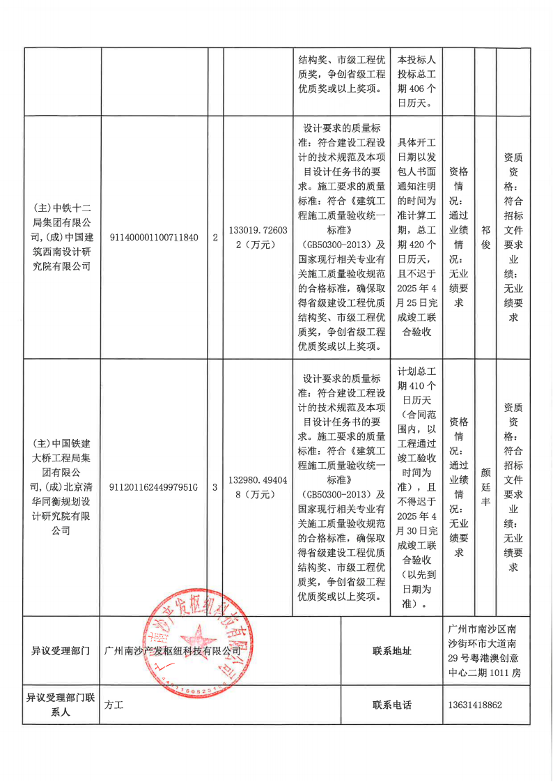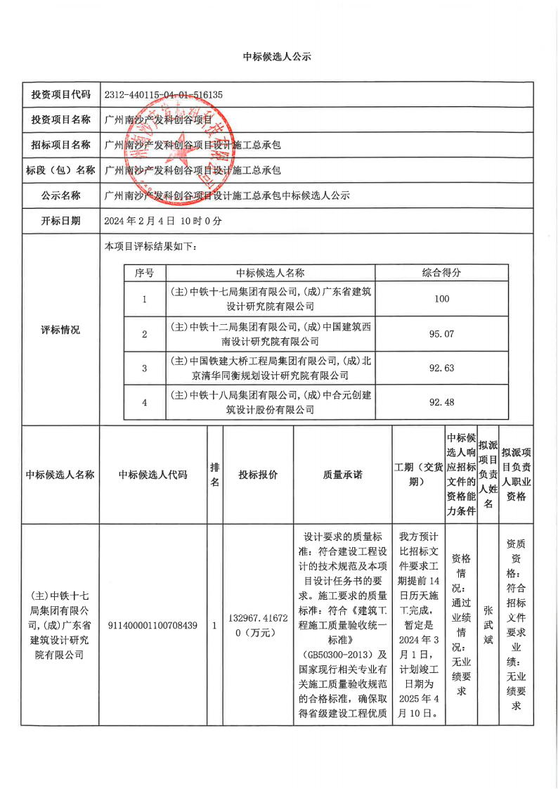 广州南沙产发科创谷项目设计施工总承包中标候选人公示