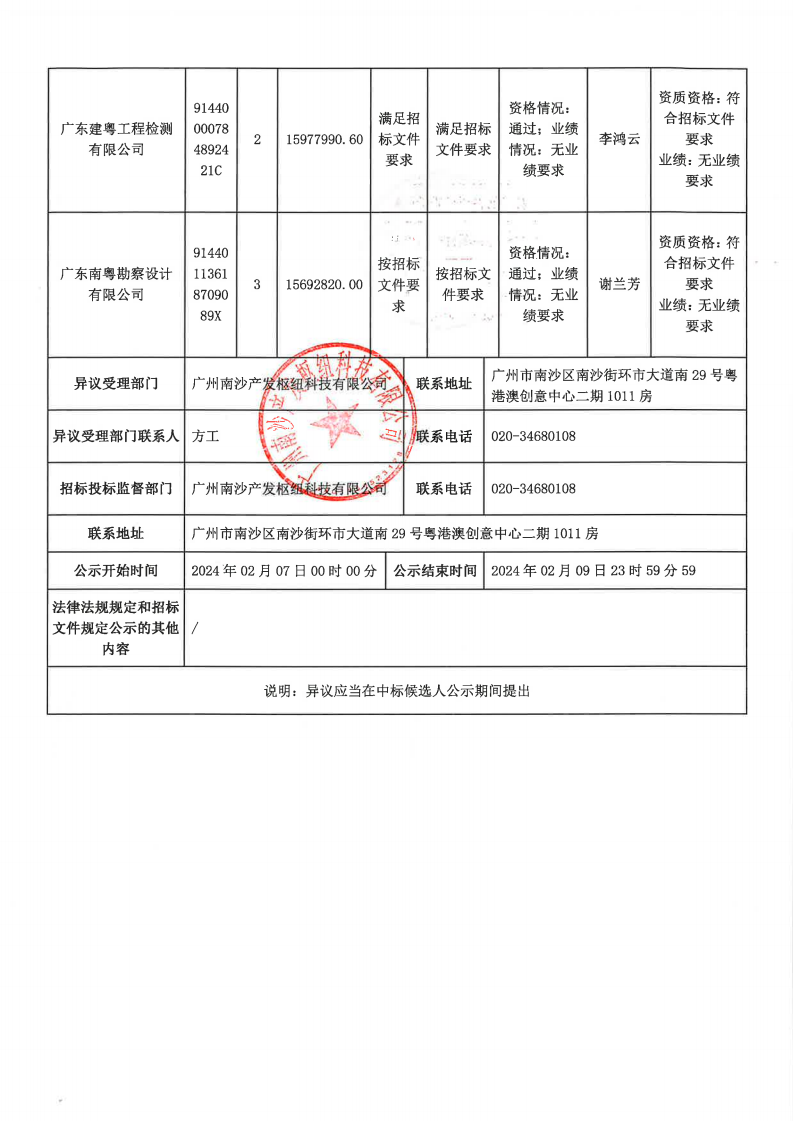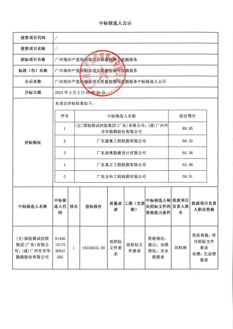 广州南沙产发科创谷项目质量检测与监测服务中标候选人公示