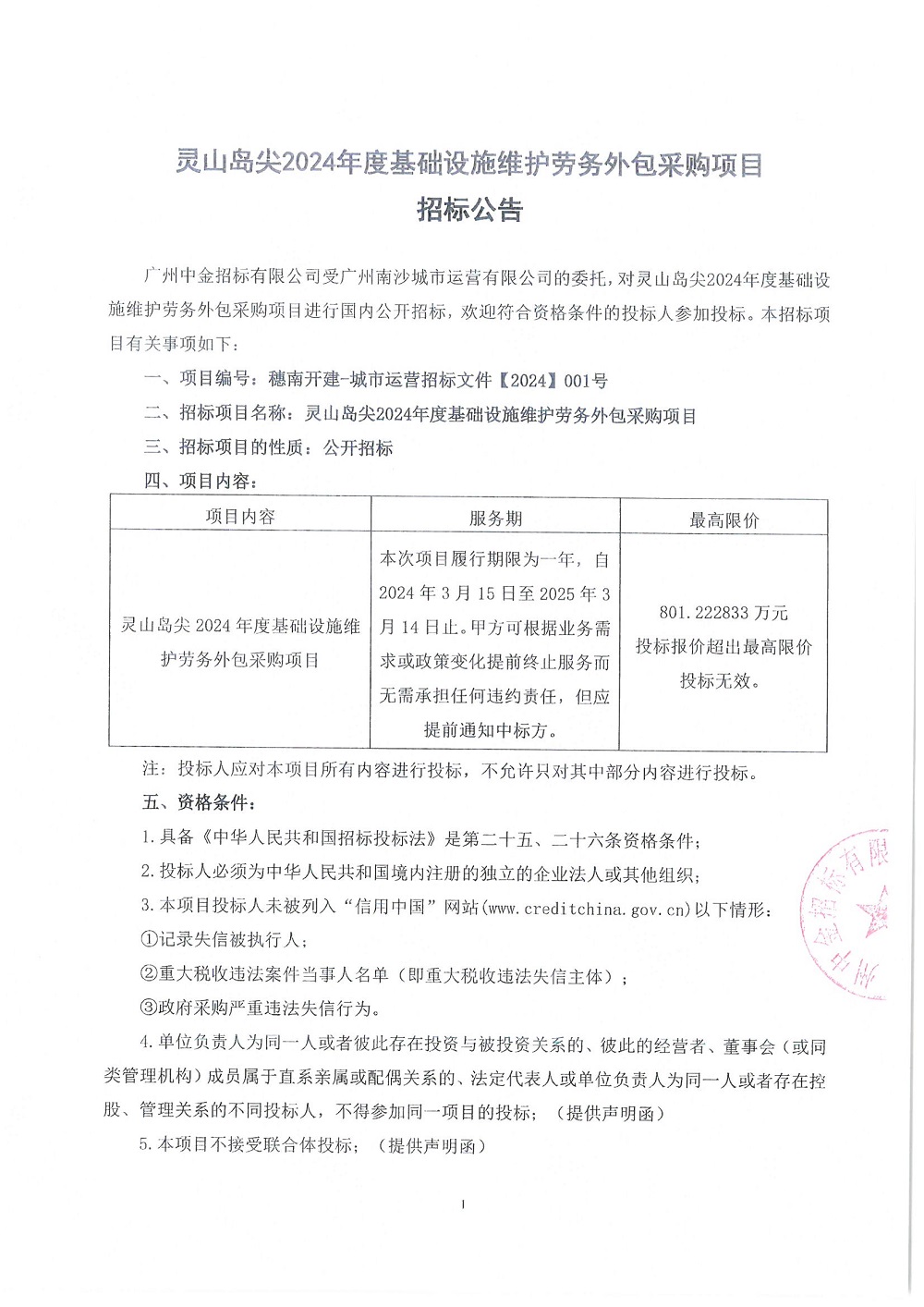 灵山岛尖2024年度基础设施维护劳务外包采购项目招标公告