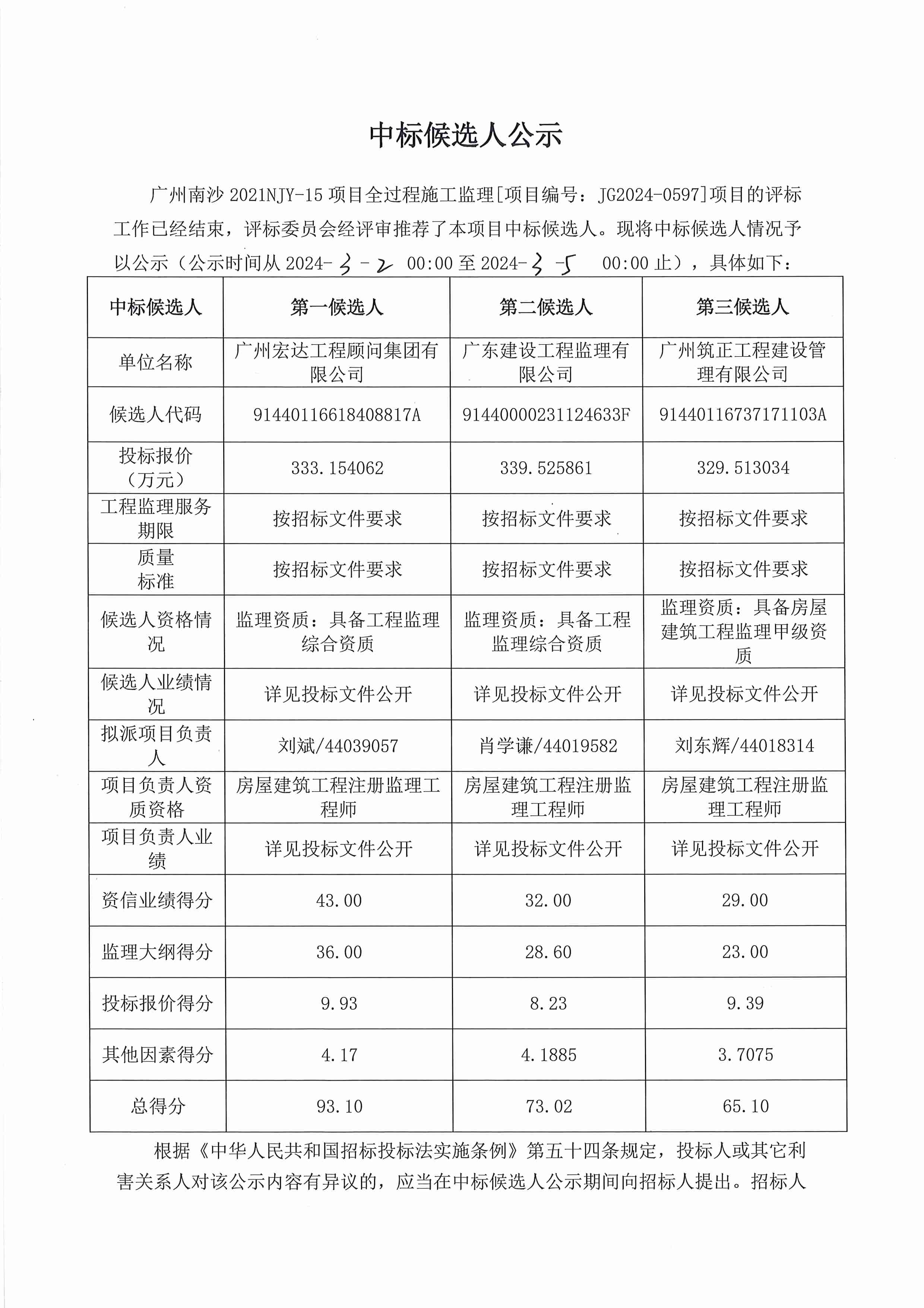 广州南沙2021NJY-15项目全过程施工监理中标候选人公示