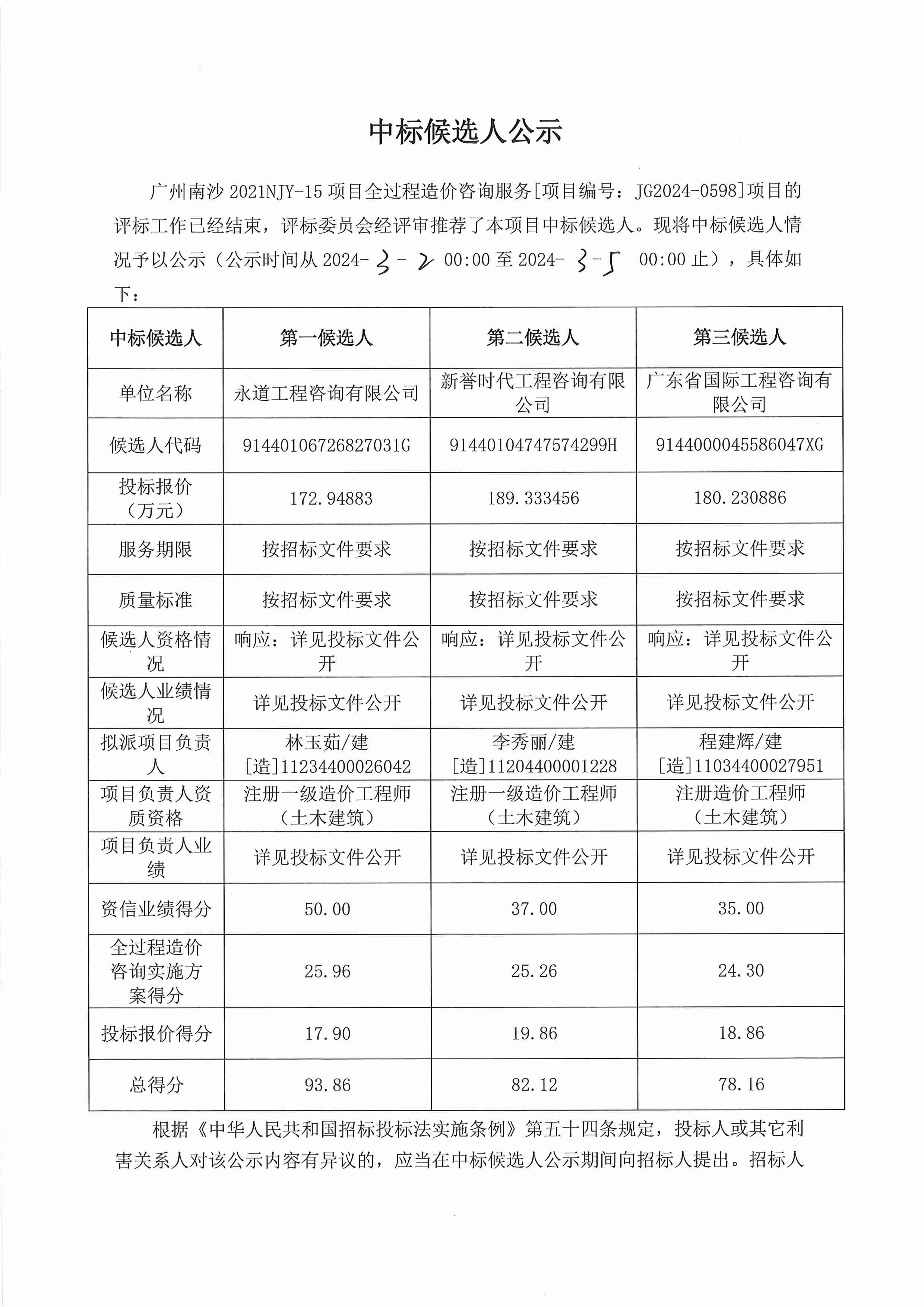广州南沙2021NJY-15项目全过程造价咨询服务中标候选人公示