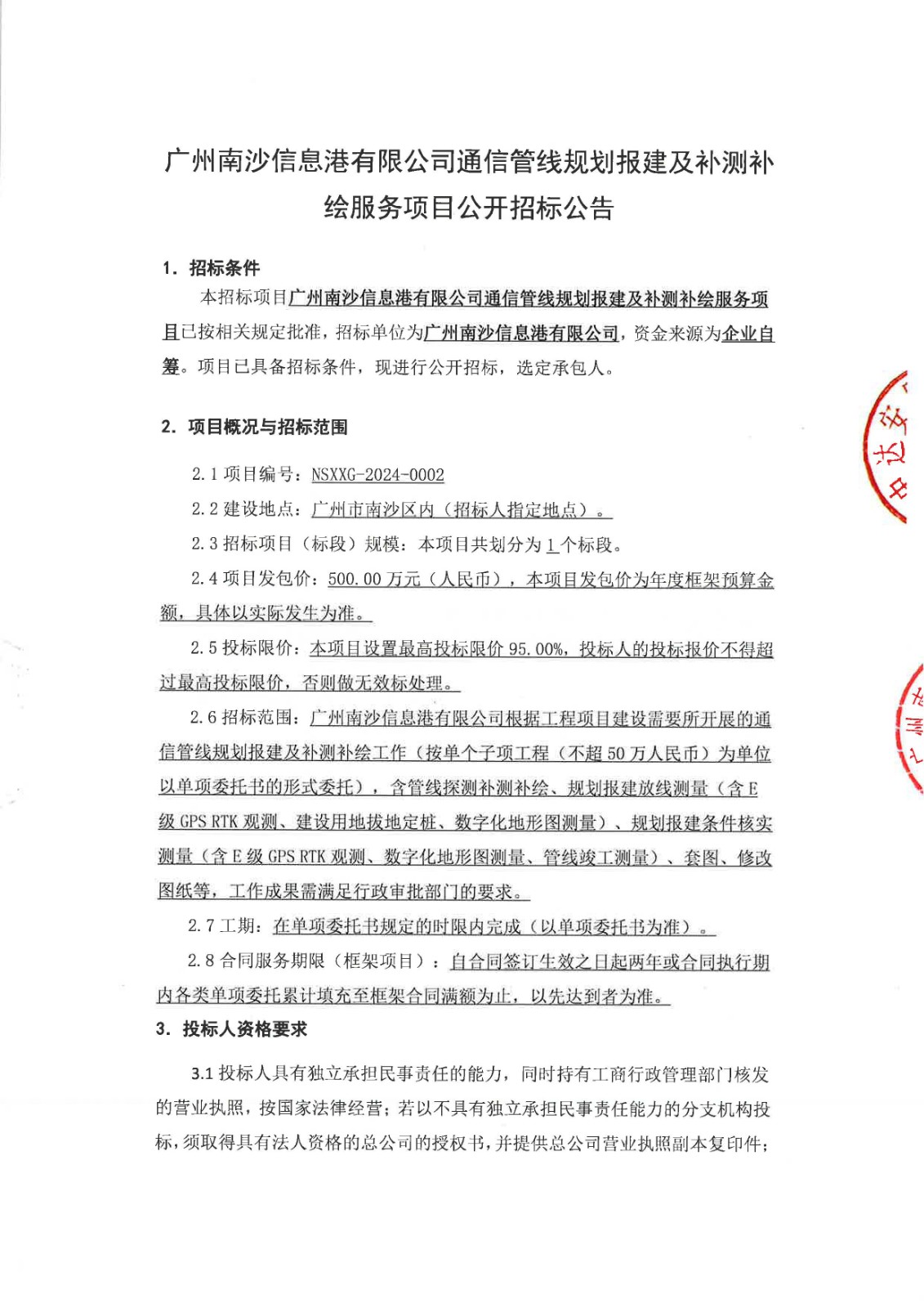 广州南沙信息港有限公司通信管线规划报建及补测补绘服务项目公开招标公告