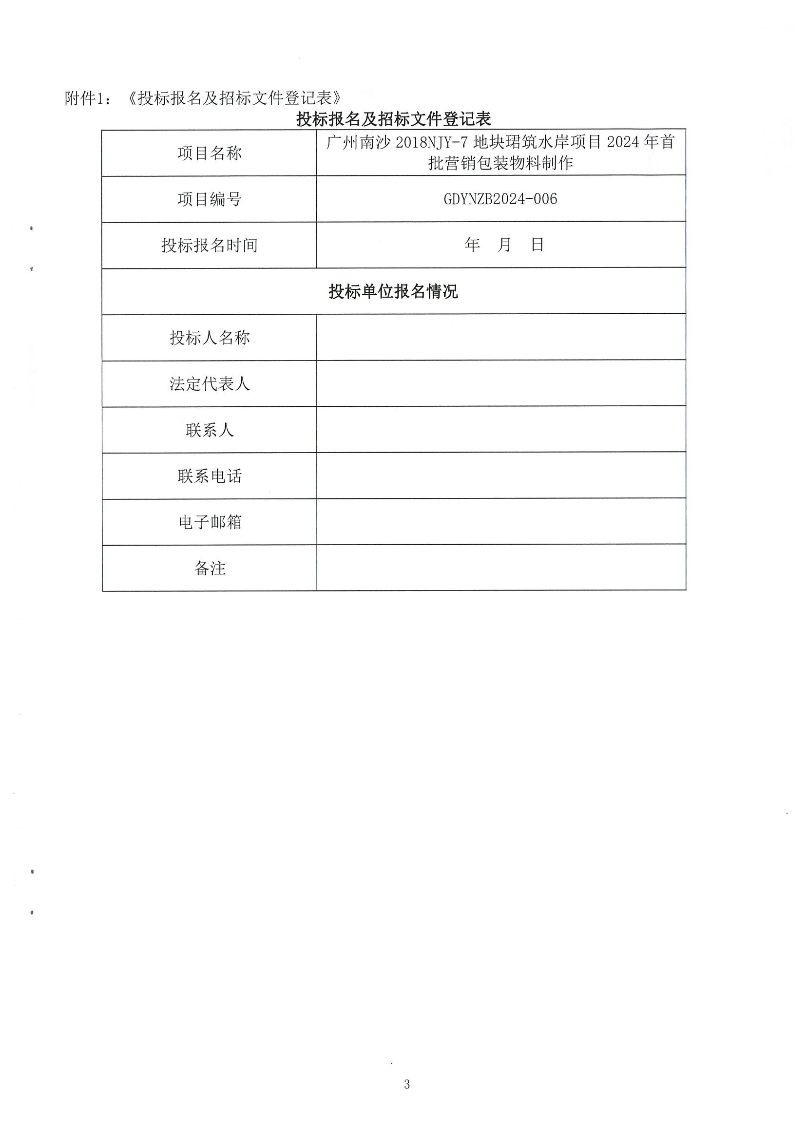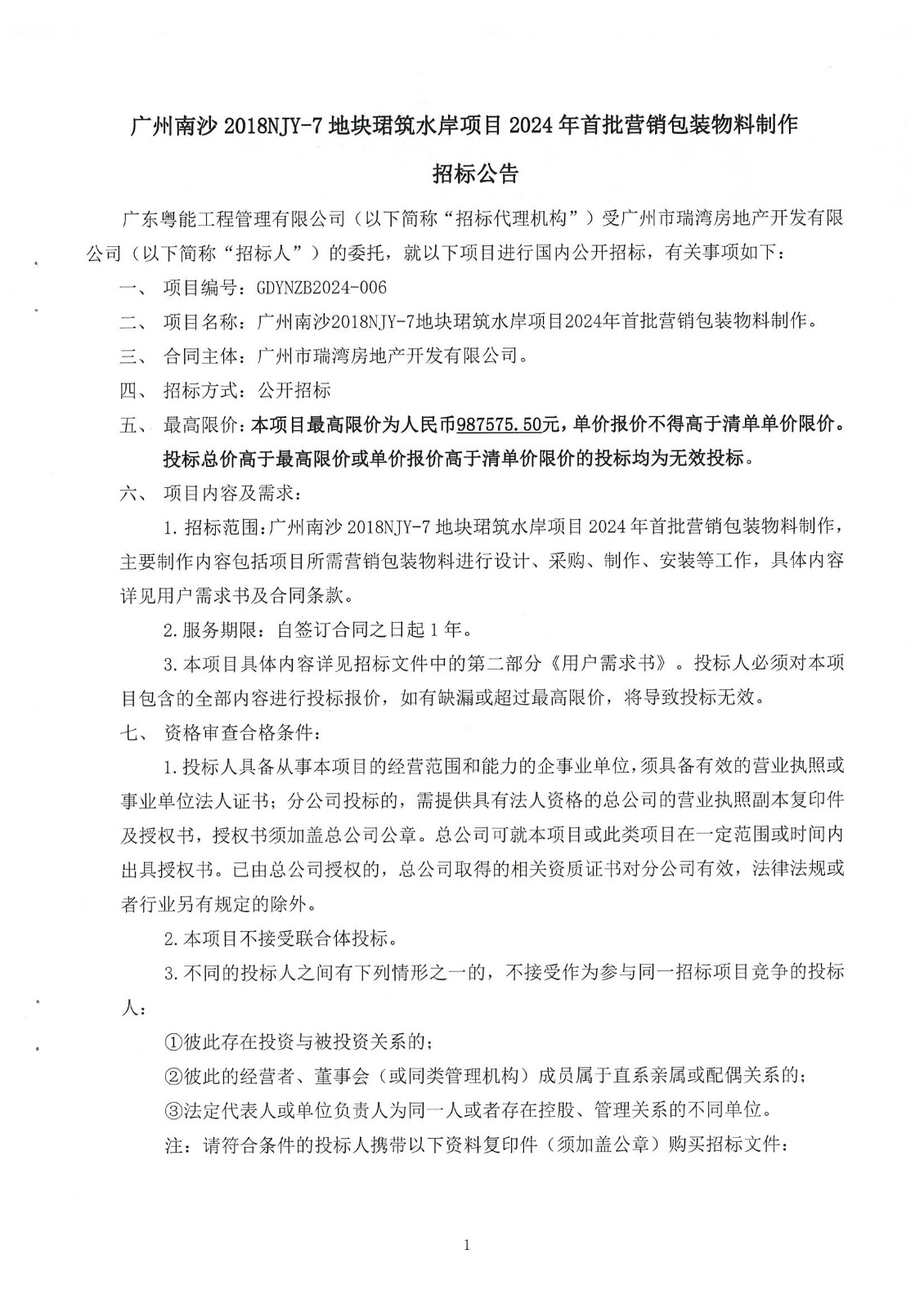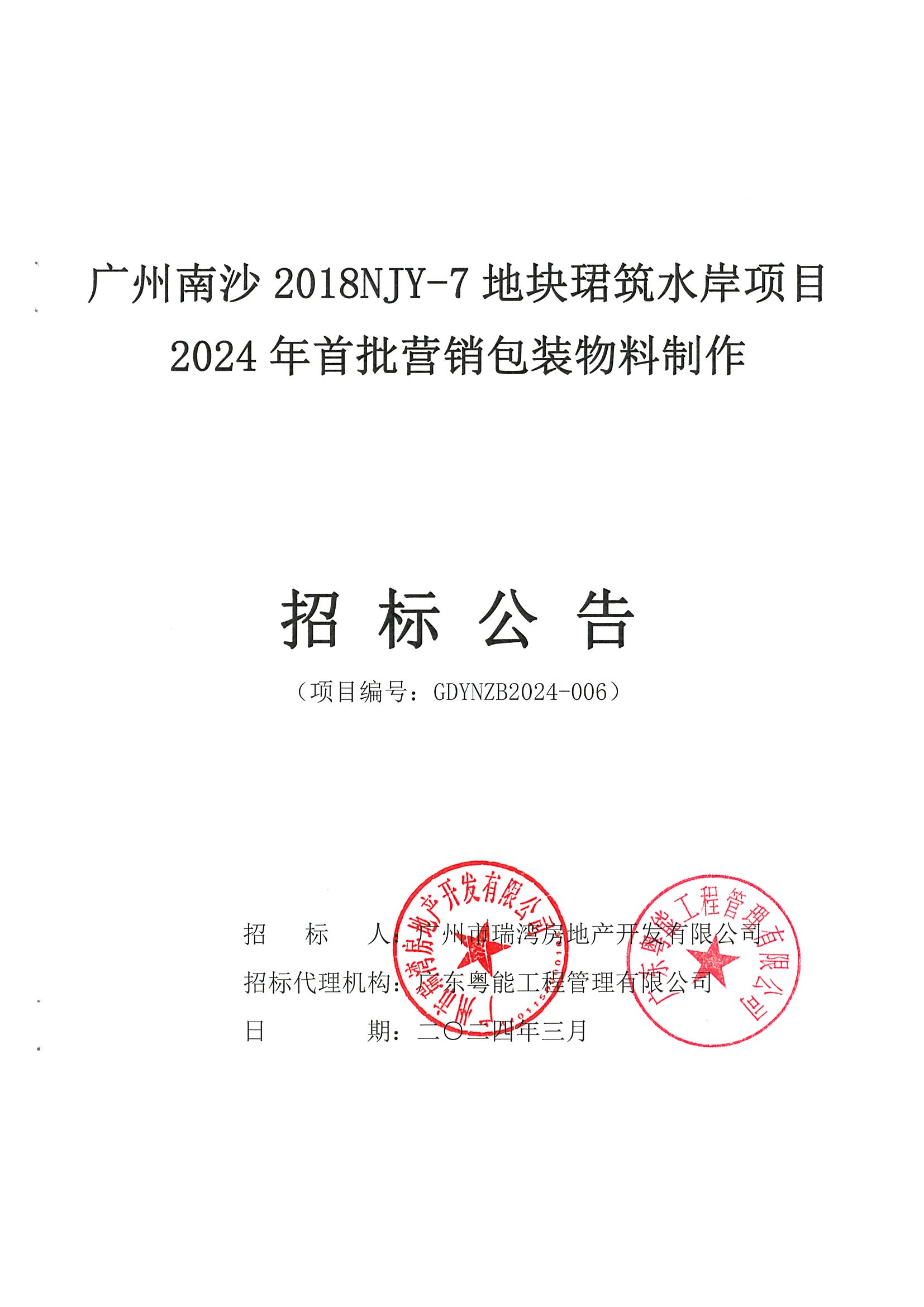 广州南沙2018NJY-7地块珺筑水岸项目2024年度首批营销包装物料制作招标公告