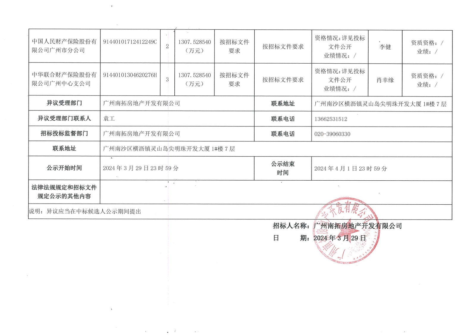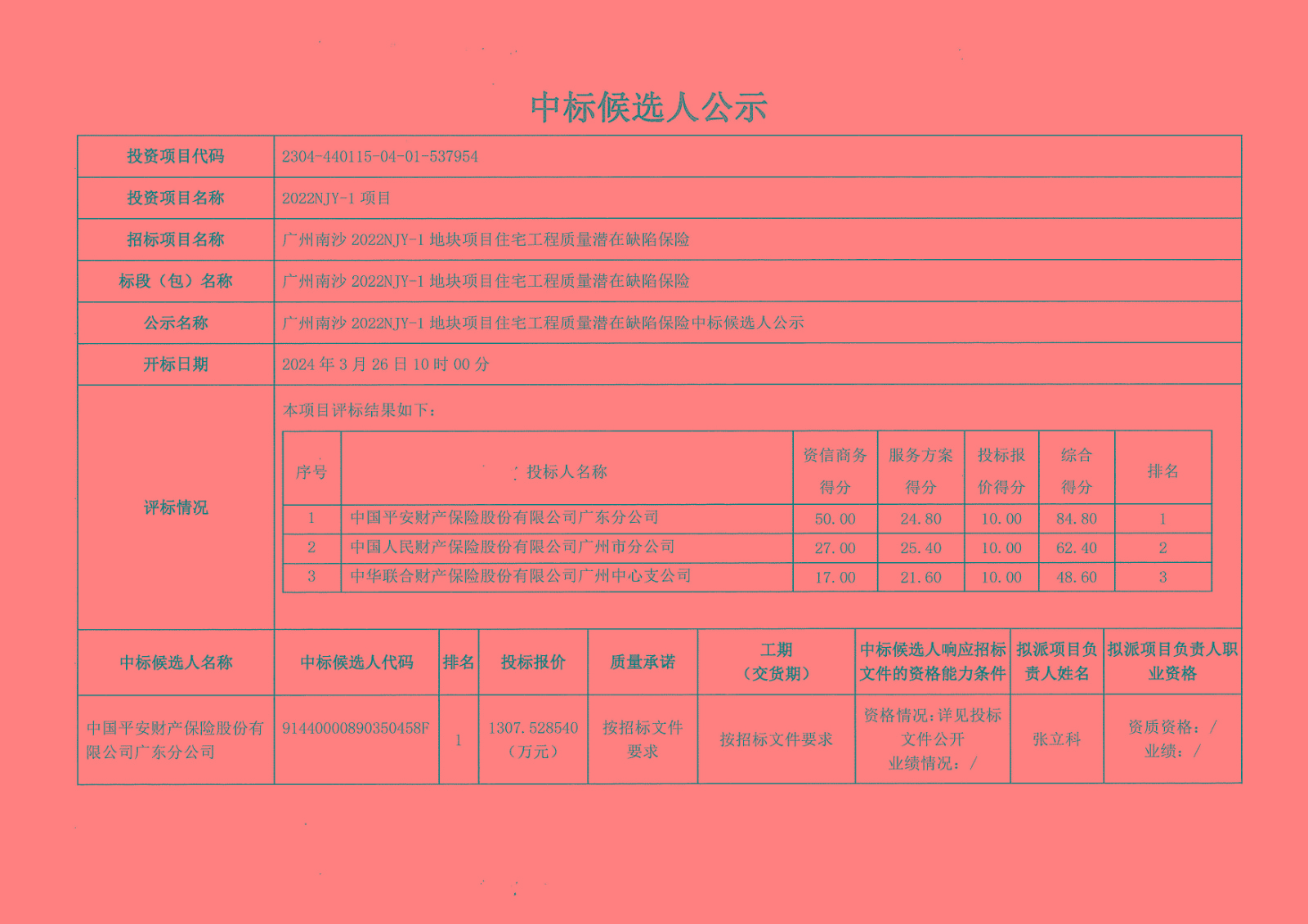 广州南沙2022NJY-1地块项目住宅工程质量潜在缺陷保险中标候选人公示