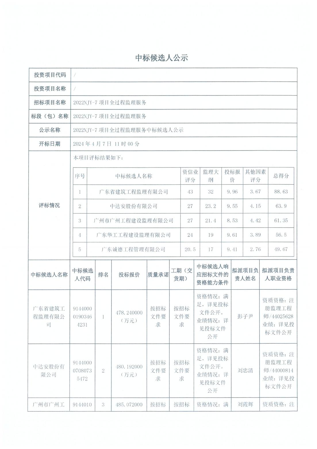 2022NJY-7 项目全过程监理服务中标候选人公示