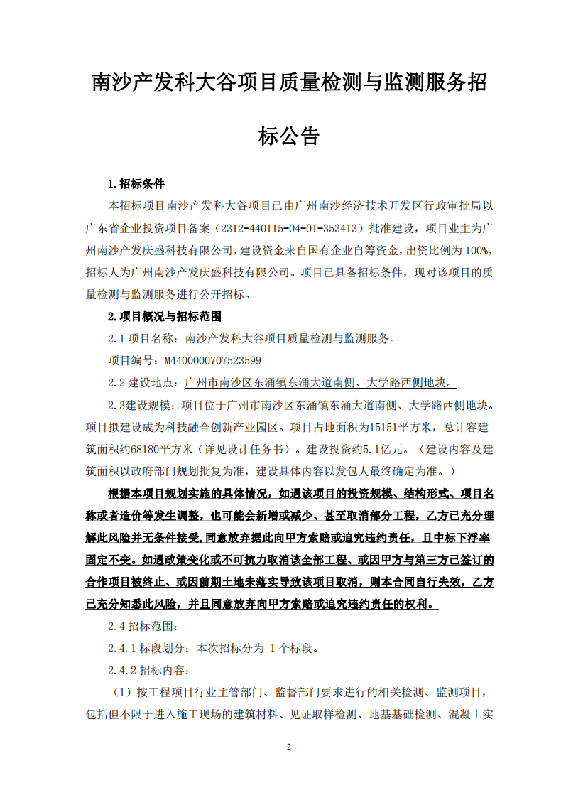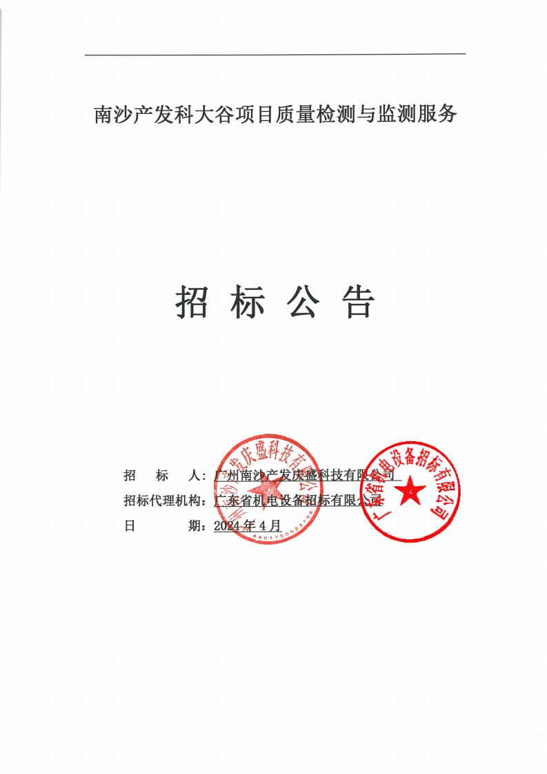 南沙产发科大谷项目质量检测与监测服务招标公告