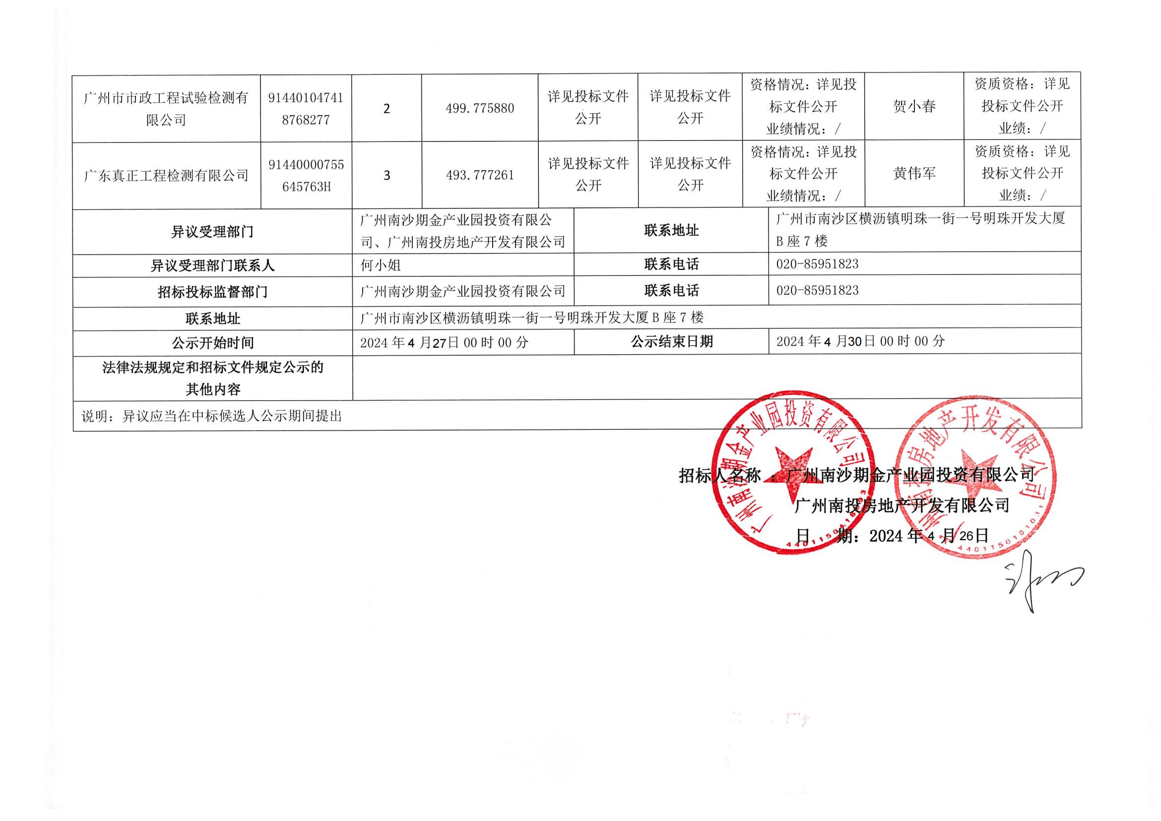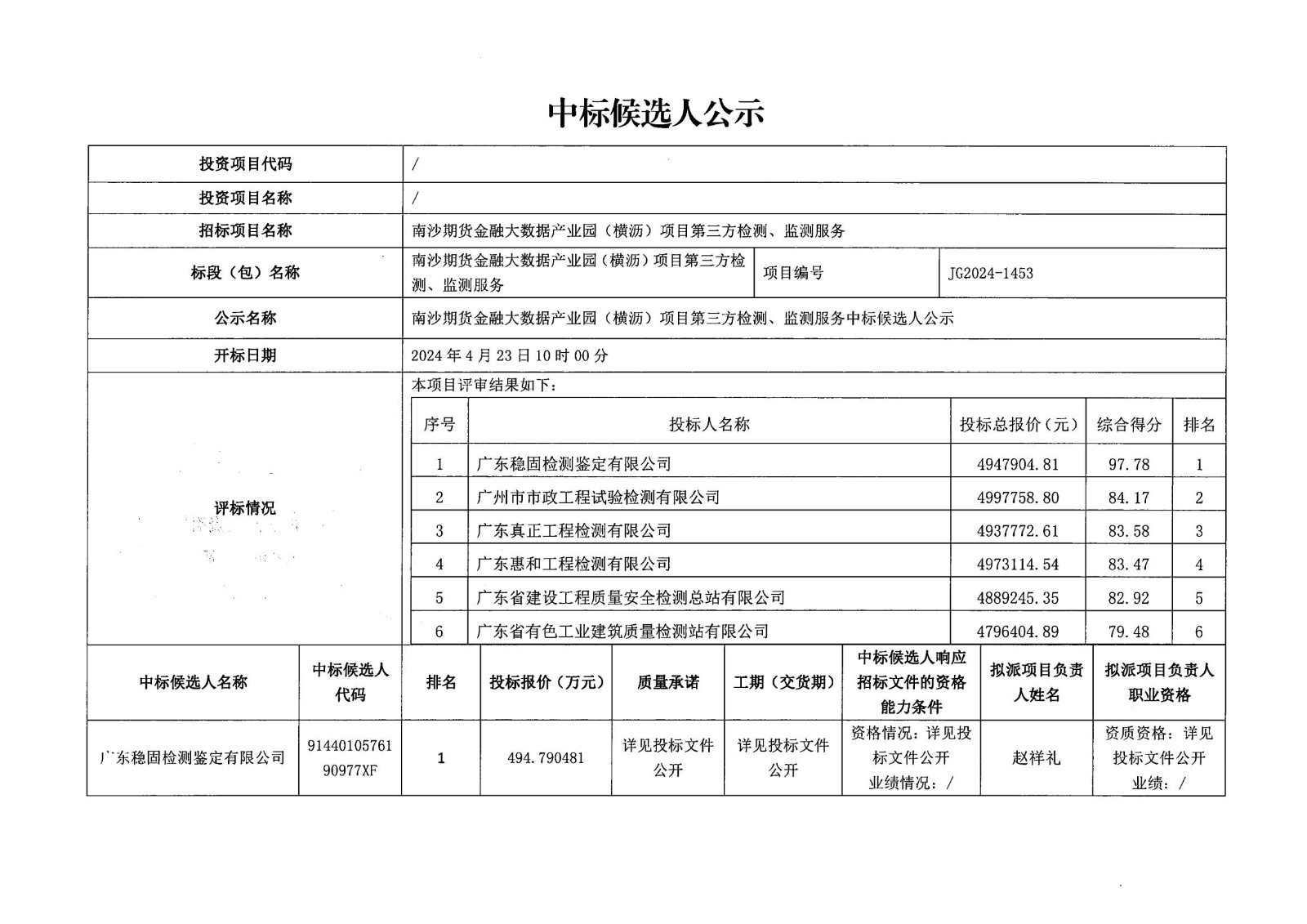 南沙期货金融大数据产业园(横沥)项目第三方检测、监测服务中标候选人公示