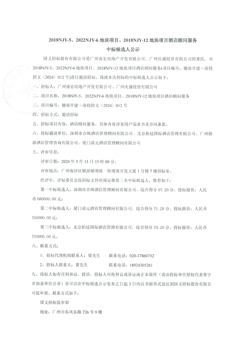 广州南投房地产开发有限公司2018NJY-5、2022NJY-6地块项目、2018NJY-12地块项目酒店顾问服务中标候选人公示