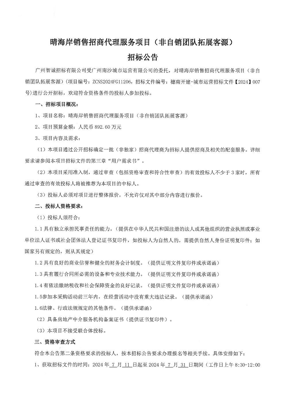 晴海岸销售招商代理服务项目(非自销团队拓展客源)招标公告