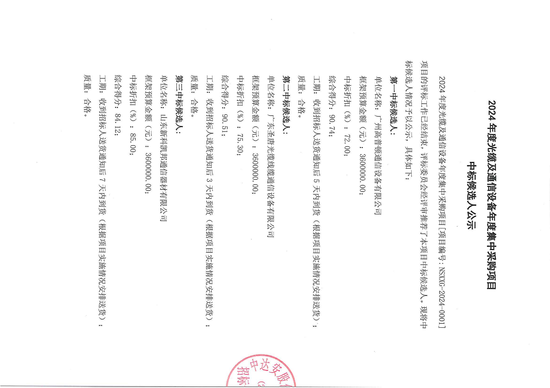 2024年度光缆及通信设备年度集中采购项目中标候选人公示