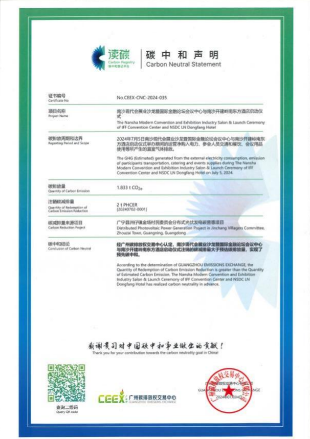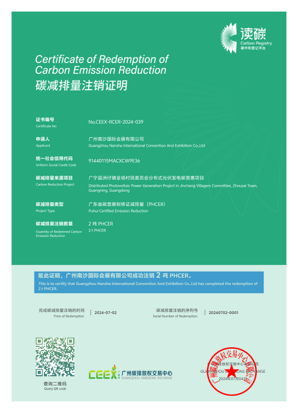 广州碳交中心对活动的运营净购入电力、参会人员交通和餐饮、会议用品使用等所产生的温室气体排放进行了专业的审核。经核定,该活动注销的碳减排量大于预估碳排放量,实现了预先碳中和。国际会展公司凭此活动注销的碳减排量为2吨PHCER(广东省碳普惠制核证排放量),获得碳减排量注销证明。